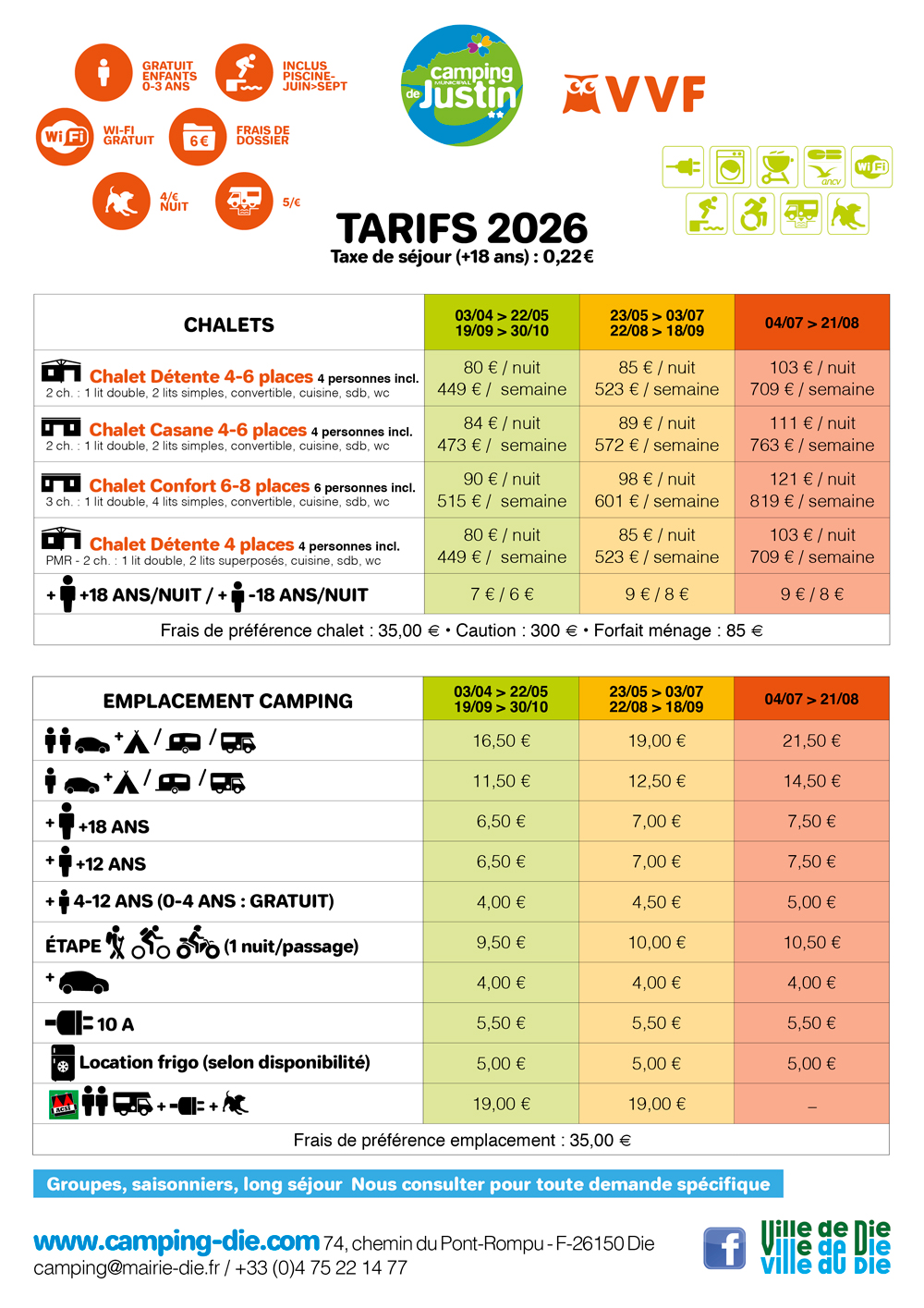 Afin de vous offrir la navigation la plus adaptée à vos besoins, nous souhaitons utiliser des cookies sur ce site avec votre consentement. En cliquant sur le bouton « Les accepter tous », vous acceptez le dépôt de l’ensemble des cookies, utilisés par Camping municipal de Justin, sur votre terminal. Ces cookies servent à des fins de suivi statistiques et fonctionnements techniques pour améliorer votre visite sur notre site. Vous pouvez les refuser en cliquant sur « Je refuse » ou « Voir les préférences » ou vous rendre sur la page politique de gestion des cookies pour plus d’informations et paramétrer vos choix selon les cookies.